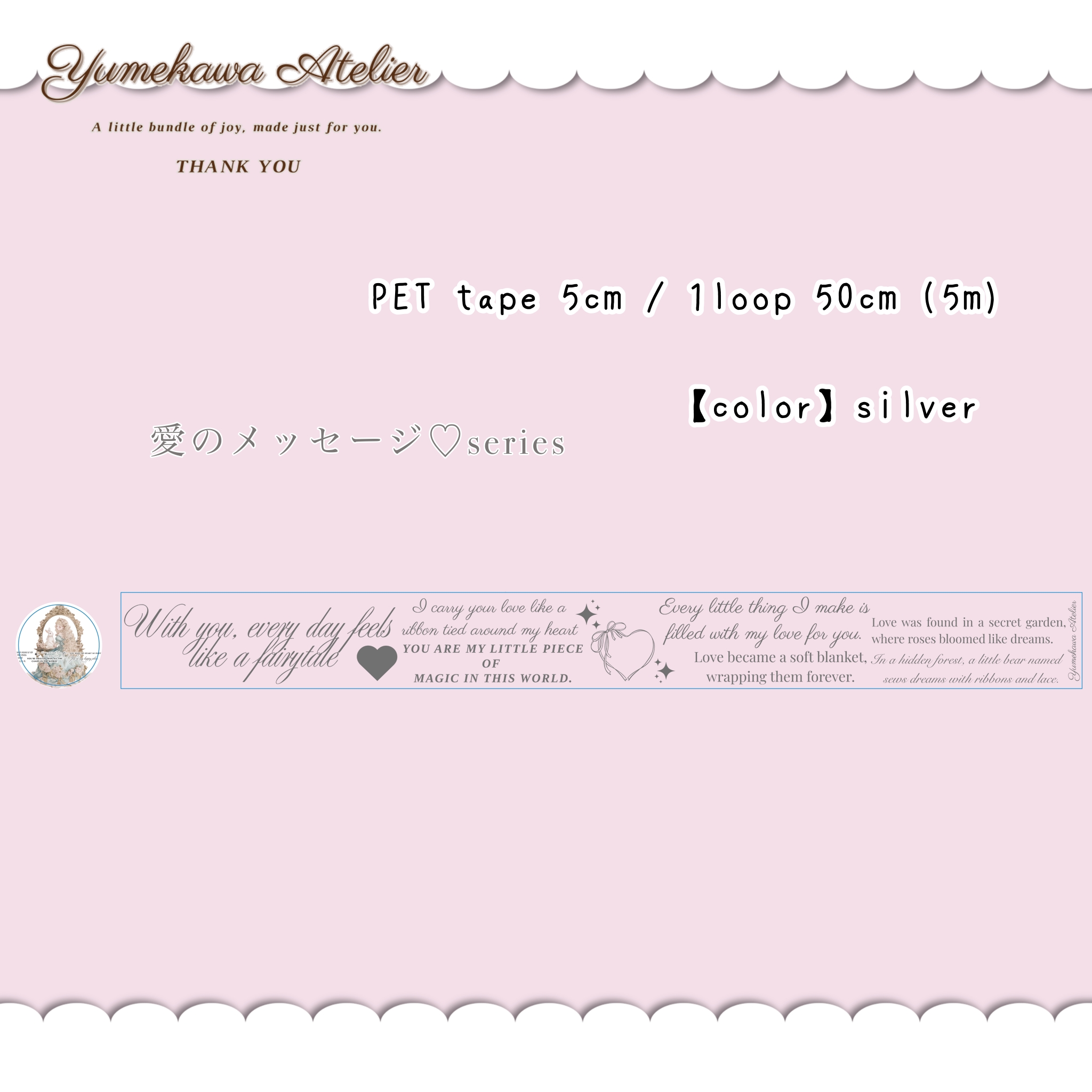 素 材: glossy(銀箔) 幅 : 50mm 長 さ:5m 1ループ: 50cm (剥離紙付き)